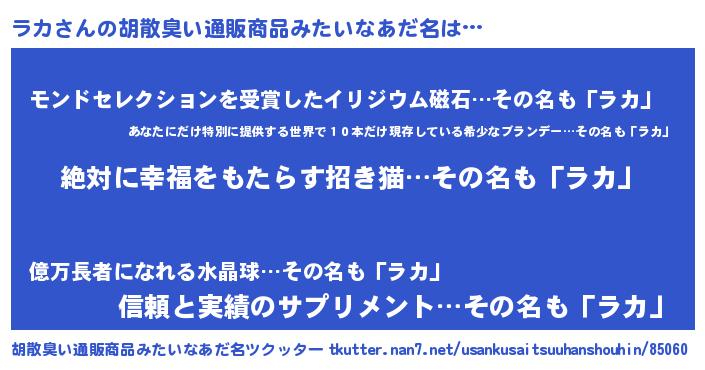 | 男性向けラノベタイトル風あだ名 | 『ラカという概念が存在しない退屈な世界 』 |