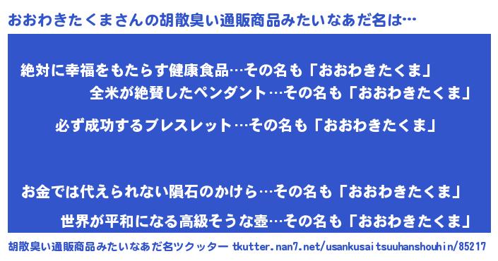 | 男性向けラノベタイトル風あだ名 | 『おおわきたくまの憂鬱』 |