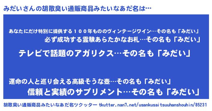 | 意味不明あだ名 | 『自称みだい』『住所不定無職みだい(4歳)』 |
