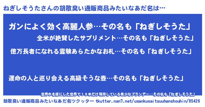 | 男性向けラノベタイトル風あだ名 | 『うちのねぎしそうたが世界を掌握している!』 |