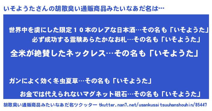 | 男性向けラノベタイトル風あだ名 | 『いそようたの嫁は女の子じゃないと思った?』 |