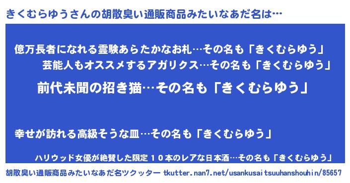 | ヘコむあだ名 | 『きくむらゆう(笑)』『きくっふぃ~』 |