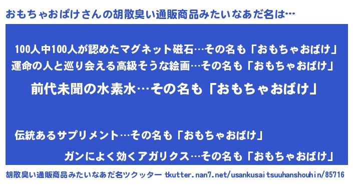 | 男性向けラノベタイトル風あだ名 | 『おもちゃおばけ~年齢イコール彼女いない歴の魔法使い~』 |