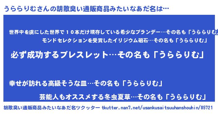 | 意味不明あだ名 | 『ペロリンうららりむ』『自称うららりむ』 |