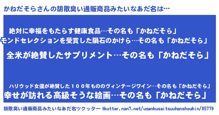 | 男性向けラノベタイトル風あだ名 | 『かねだそらの嫁は女の子じゃないと思った?』 |