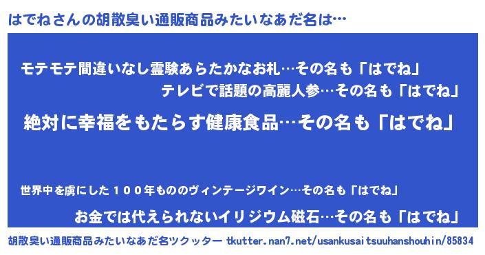 | 男性向けラノベタイトル風あだ名 | 『はでねという概念が存在しない退屈な世界 』 |