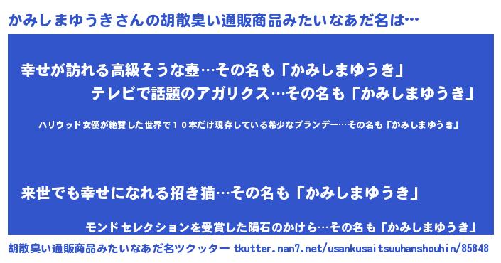 | 意味不明あだ名 | 『住所不定無職かみしまゆうき(74歳)』 |