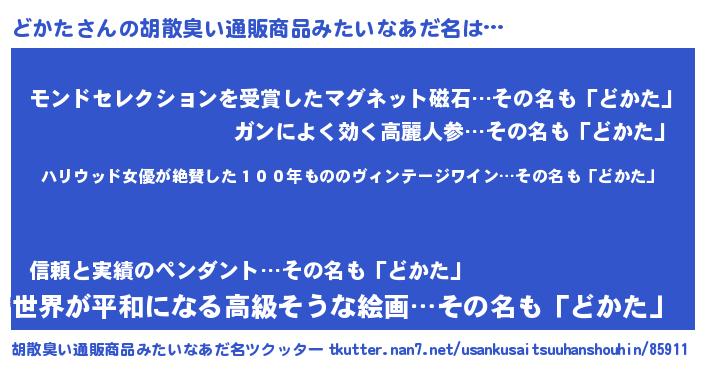 | 意味不明あだ名 | 『住所不定無職どかた(9歳)』『自称どかた』 |