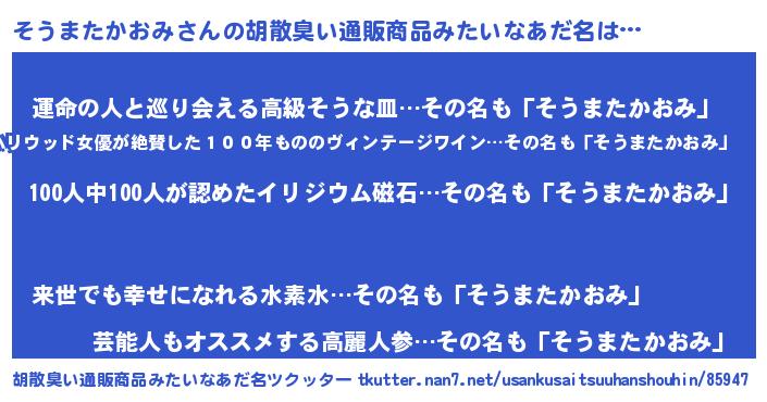 | 男性向けラノベタイトル風あだ名 | 『おまえをオタクにしてやるから、俺をそうまたかおみにしてくれ! 』 |