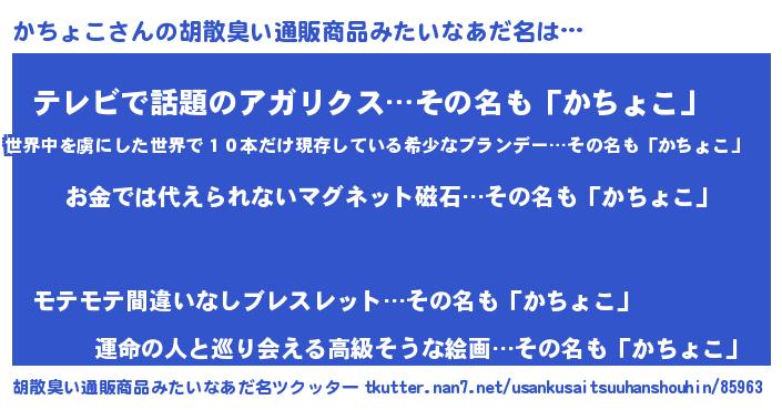 | 意味不明あだ名 | 『たけのこ科かちょこ属』『自称かちょこ』 |