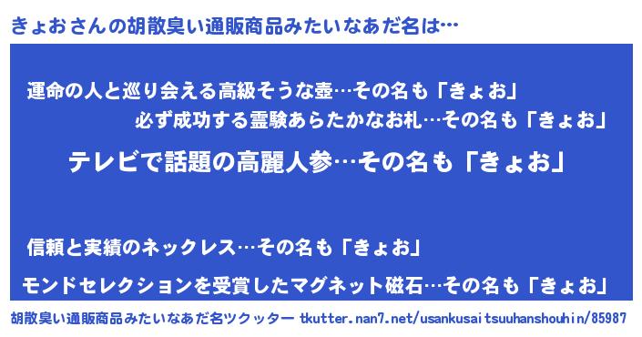 | ヘコむあだ名 | 『豆乳』『きょにー』『きょぷりん』 |