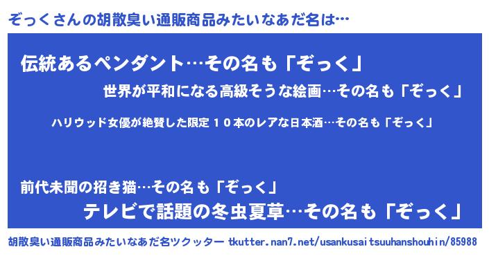 | 意味不明あだ名 | 『住所不定無職ぞっく(53歳)』『自称ぞっく』 |