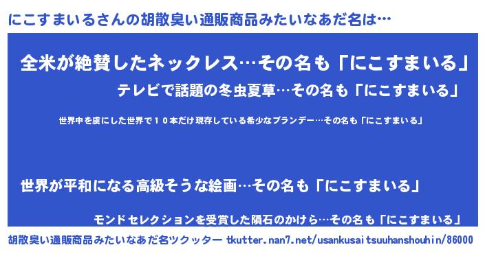 | 意味不明あだ名 | 『住所不定無職にこすまいる(98歳)』 |