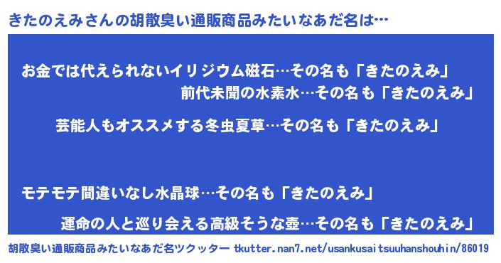 | 男性向けラノベタイトル風あだ名 | 『Re:きたのえみから始める異世界生活』 |