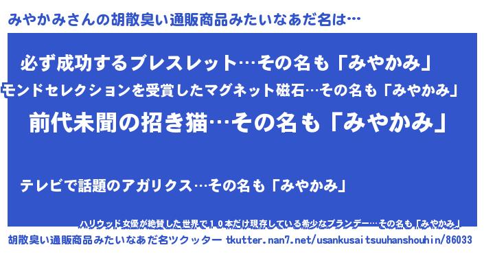 | 意味不明あだ名 | 『永久保存みやかみ』『ペロリンみやかみ』 |