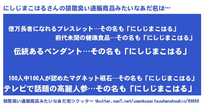| 意味不明あだ名 | 『とにかく怪しいにしじまこはる』 |