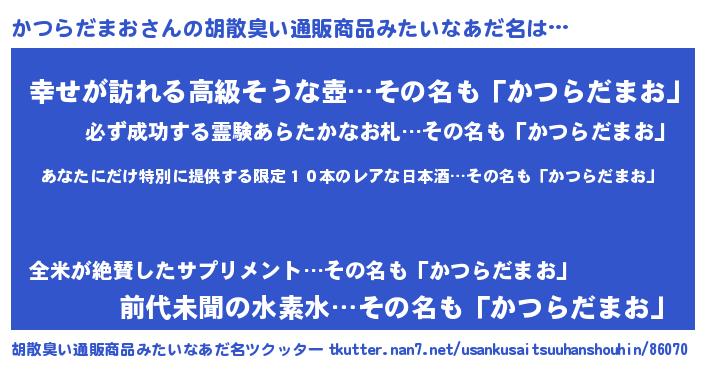 | 男性向けラノベタイトル風あだ名 | 『この素晴らしい世界にかつらだまおを!』 |