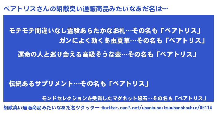 | 男性向けラノベタイトル風あだ名 | 『うちのベアトリスが世界を掌握している!』 |