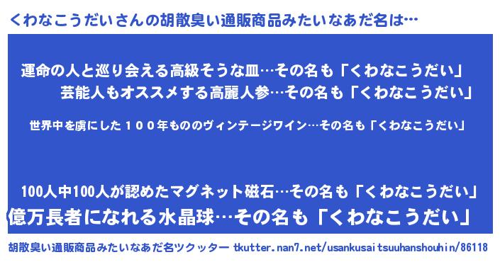 | 意味不明あだ名 | 『住所不定無職くわなこうだい(10歳)』 |
