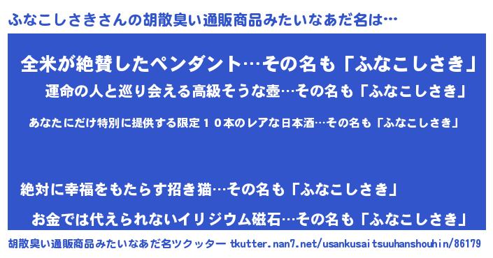 | 男性向けラノベタイトル風あだ名 | 『ふなこしさき~年齢イコール彼女いない歴の魔法使い~』 |
