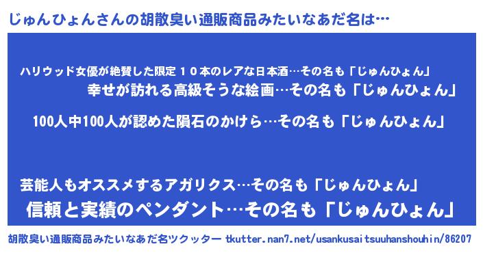 | ヘコむあだ名 | 『じゅぷりん』『豆乳』『じゅにー』 |
