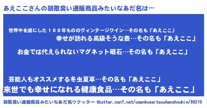 | ヘコむあだ名 | 『あえここ(笑)』『なまこ酢』 |
