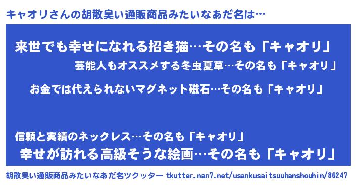 | ヘコむあだ名 | 『キャオリ(小並感)』『豆乳』 |