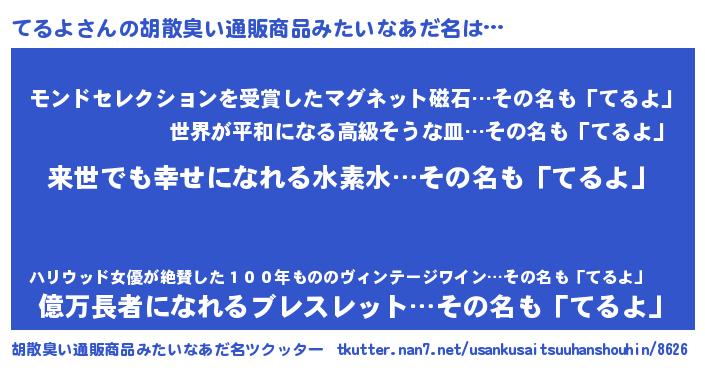 | 男性向けラノベタイトル風あだ名 | 『てるよという概念が存在しない退屈な世界 』 |