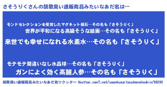 | ヘコむあだ名 | 『さそうりく(震え声)』『酢こんぶ』 |