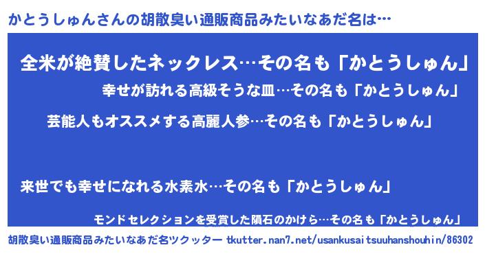| 女子向けラノベタイトル風あだ名 | 『かとうしゅんストレイドッグス』 |