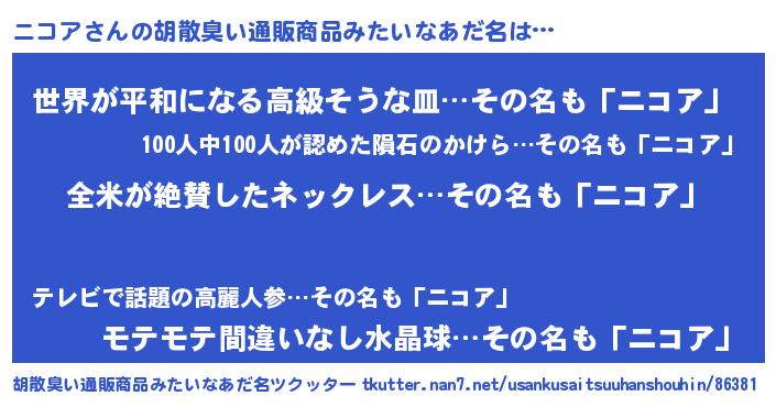 | ヘコむあだ名 | 『ニコ太郎』『酢こんぶ』『ニコもー』 |