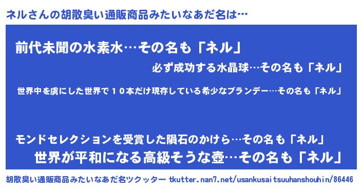 | 意味不明あだ名 | 『住所不定無職ネル(77歳)』『永久保存ネル』 |