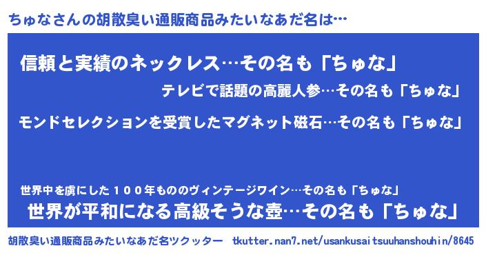 | 欧米人風あだ名 | 『ダニエルちゅな』『ウサインちゅな』 |