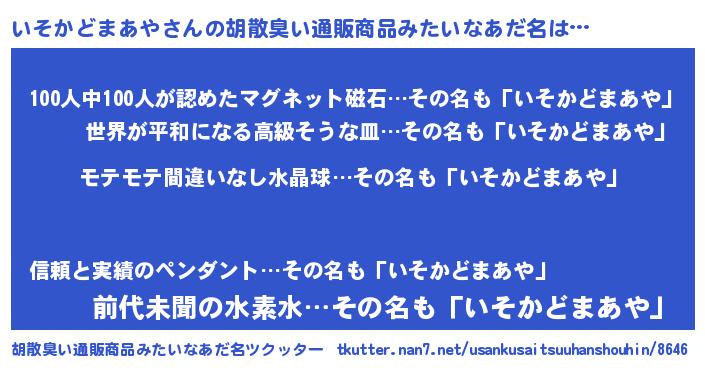 | ヘコむあだ名 | 『いそにゅー』『いそかどまあや(笑)』 |