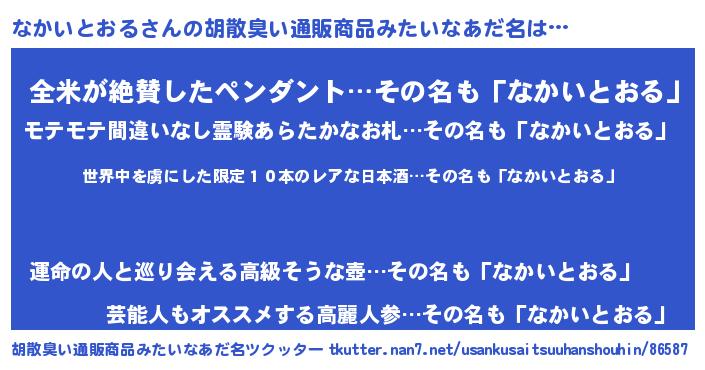 | 意味不明あだ名 | 『住所不定無職なかいとおる(47歳)』 |