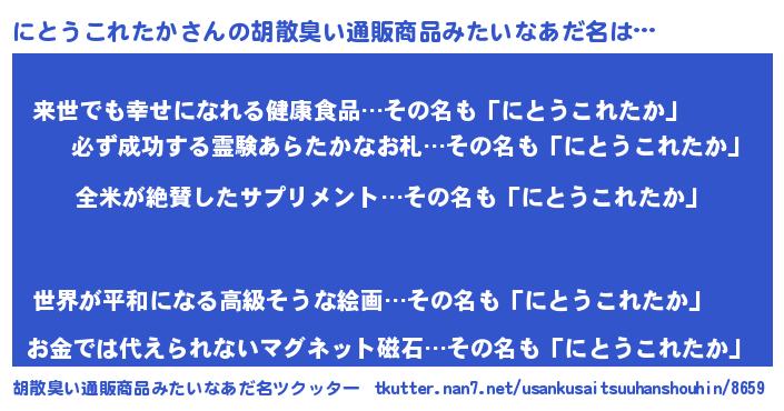 | 男性向けラノベタイトル風あだ名 | 『にとうこれたかの嫁は女の子じゃないと思った?』 |