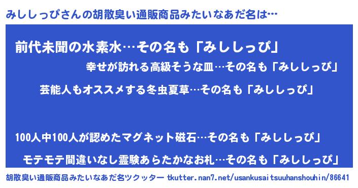 | 意味不明あだ名 | 『自称みししっぴ』『永久保存みししっぴ』 |