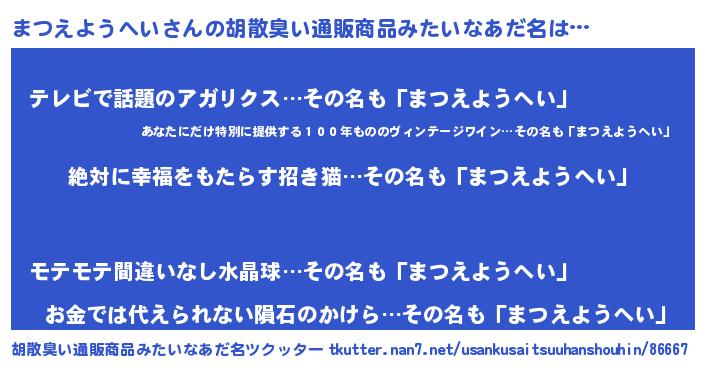| 男性向けラノベタイトル風あだ名 | 『まつえようへいという概念が存在しない退屈な世界 』 |