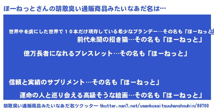 | 男性向けラノベタイトル風あだ名 | 『うちのほーねっとが世界を掌握している!』 |