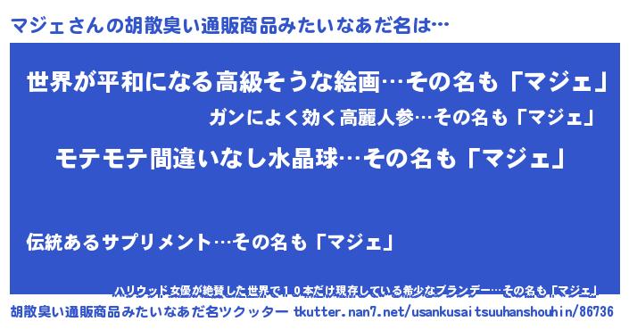 | 男性向けラノベタイトル風あだ名 | 『マジェの憂鬱』『魔弾の王とマジェ』 |