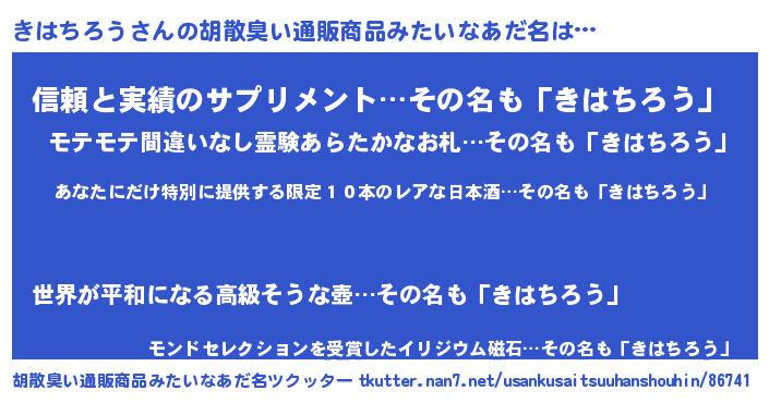 | 男性向けラノベタイトル風あだ名 | 『この素晴らしい世界にきはちろうを!』 |