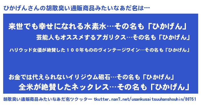 | 意味不明あだ名 | 『住所不定無職ひかげん(9歳)』 |