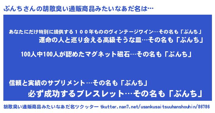 | 男性向けラノベタイトル風あだ名 | 『ブンチスレイヤー』『魔弾の王とぶんち』 |