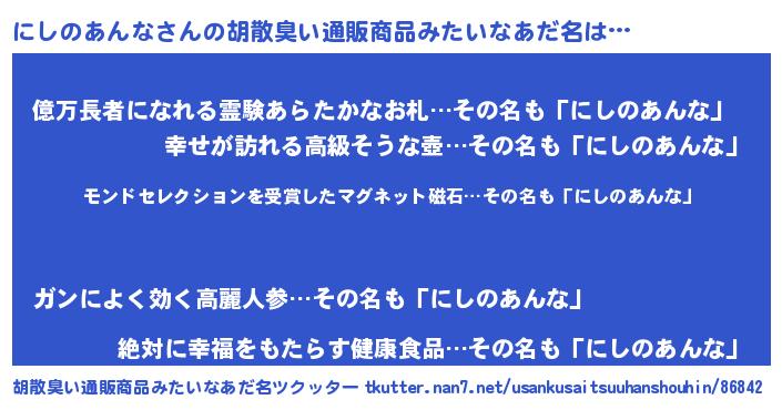 | ヘコむあだ名 | 『にしふぇ~』『にしのあんな(遠い目)』 |
