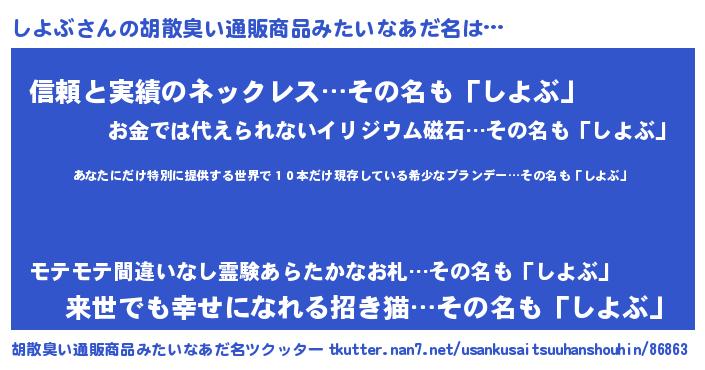 | 意味不明あだ名 | 『住所不定無職しよぶ(98歳)』 |