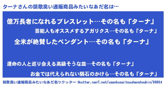 | 男性向けラノベタイトル風あだ名 | 『ターナに滅ぼされるだけの簡単なお仕事です』 |