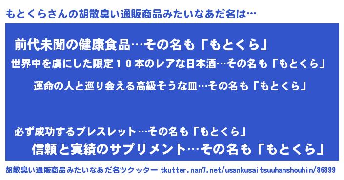 | 男性向けラノベタイトル風あだ名 | 『もとくらに滅ぼされるだけの簡単なお仕事です』 |