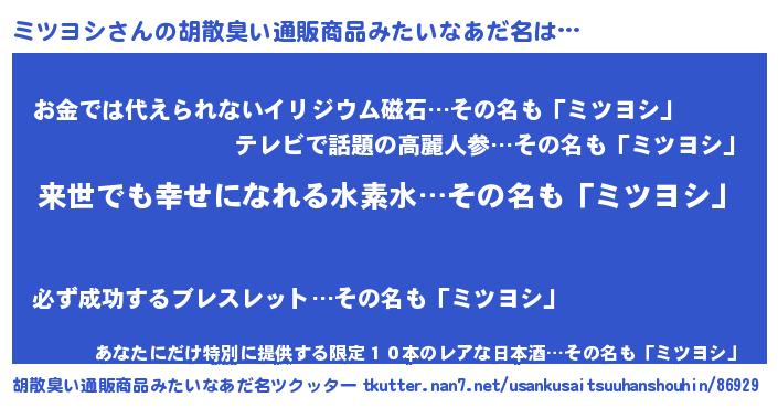 | ヘコむあだ名 | 『ミツヨシ(苦笑)』『ミツにゅー』 |
