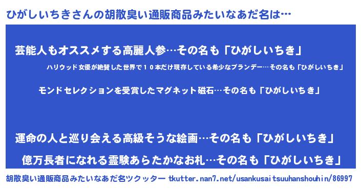 | 男性向けラノベタイトル風あだ名 | 『ノーゲーム・ノーヒガシイチキ』 |