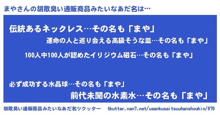 | ヘコむあだ名 | 『まや太郎』『まや(爆)』『酢こんぶ』 |